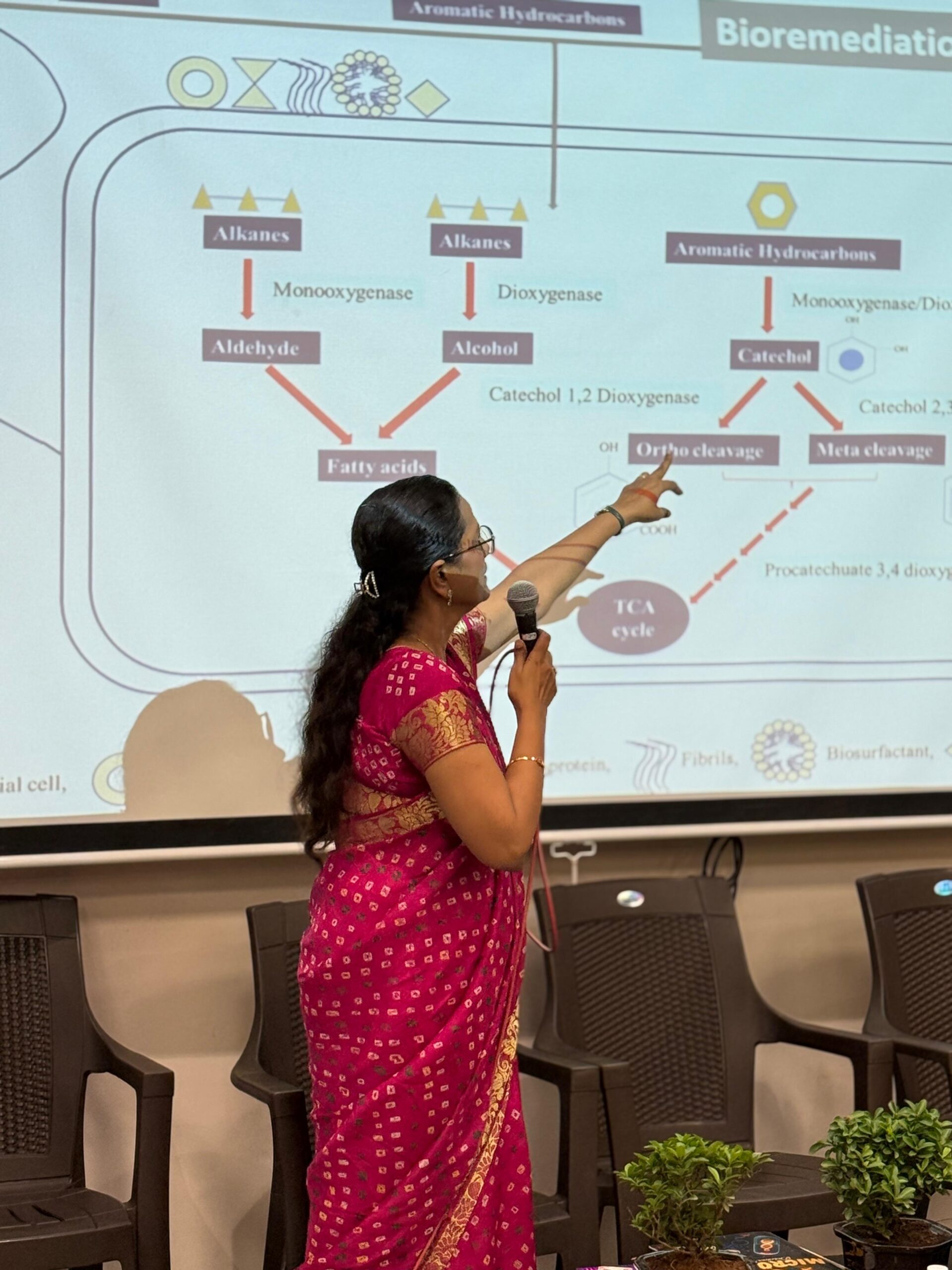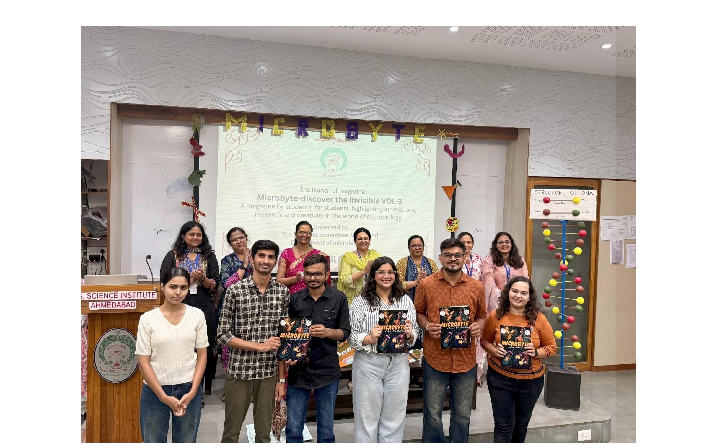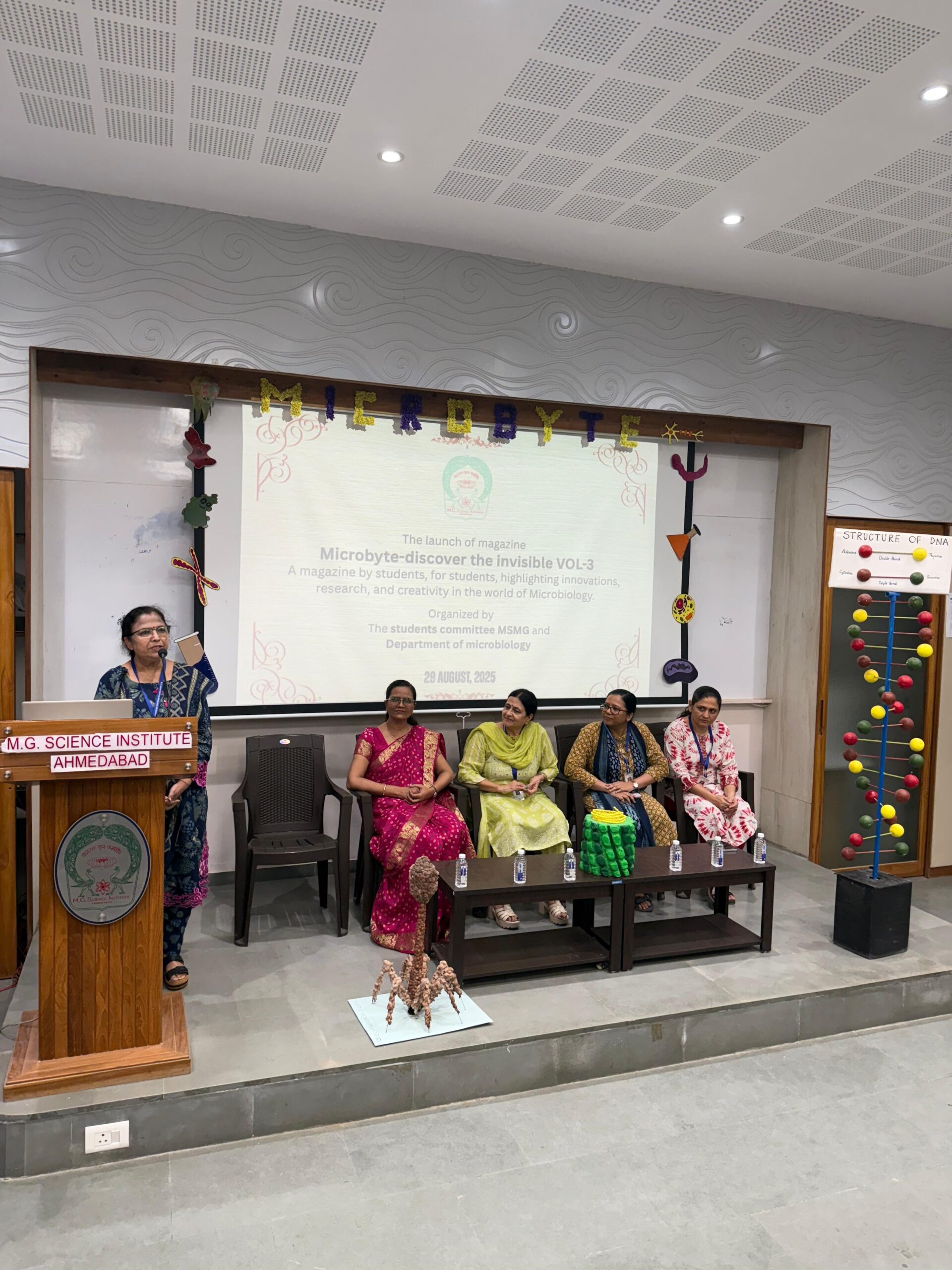 The Department of Microbiology proudly launched the third edition of its annual microbiology magazine, Microbyte – Discover the Invisibles (Vol-3), on 29th August 2025. This edition continues to serve as a vibrant platform for students to showcase research articles, creative work, and innovative ideas, reflecting the department’s dedication to academic excellence and scientific exploration. The launch was followed by an enlightening guest lecture by Dr. Nasreen Munshi, Assistant Professor at the Institute of Science, Nirma University, on the topic “Environmental Bioremediation Lab.” Her talk offered deep insights into environmental microbiology and sustainable solutions, inspiring students to explore research opportunities and innovative practices in the field.