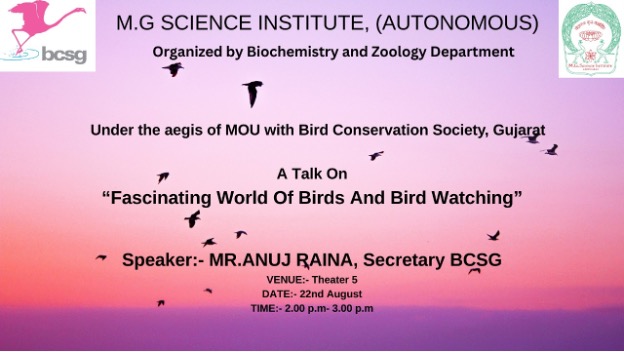 A special program, under the aegis on an MOU with Bird conservation Society, Gujarat (BCSG) was organized by Biochemistry & Zoology Department at M.G. Science Institute on the topic of “Fascinating World of Birds and Bird Watching.”