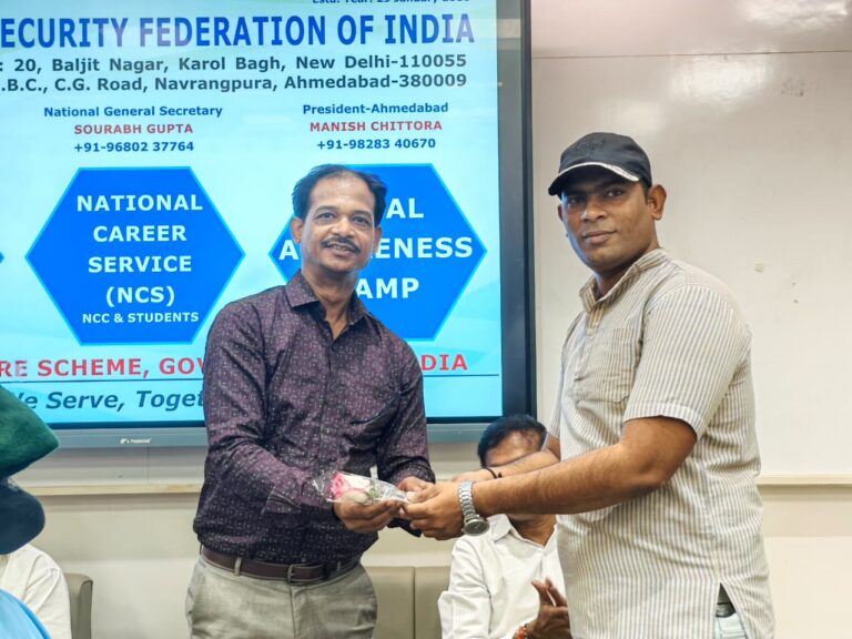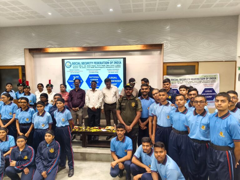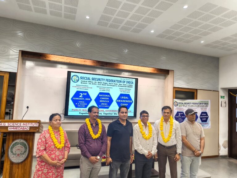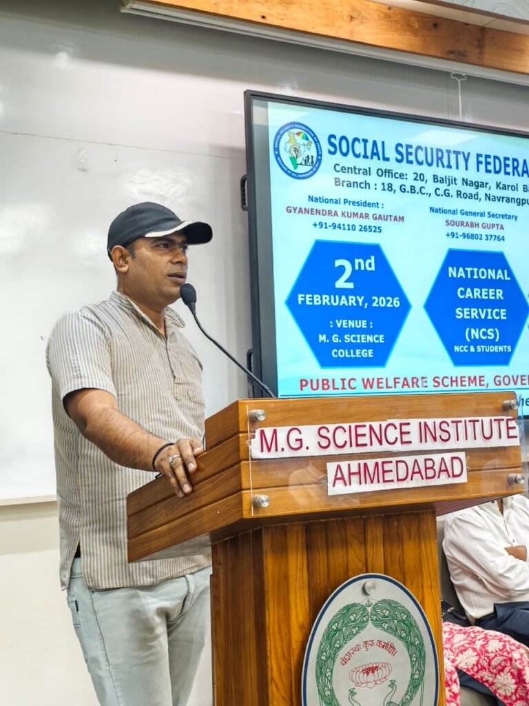 A Job and Legal Awareness Camp under the National Career Service (NCS) was successfully organized by M.G. Science Institute, Ahmedabad, in collaboration with the Social Security Federation of India, on 02 February 2026. The programme aimed to create awareness among NCC cadets and students regarding Government welfare schemes, employment opportunities, career guidance, and legal rights, thereby empowering youth for