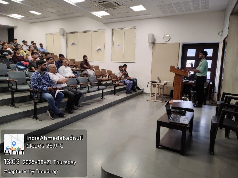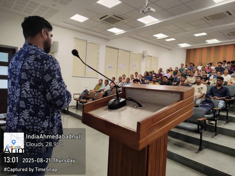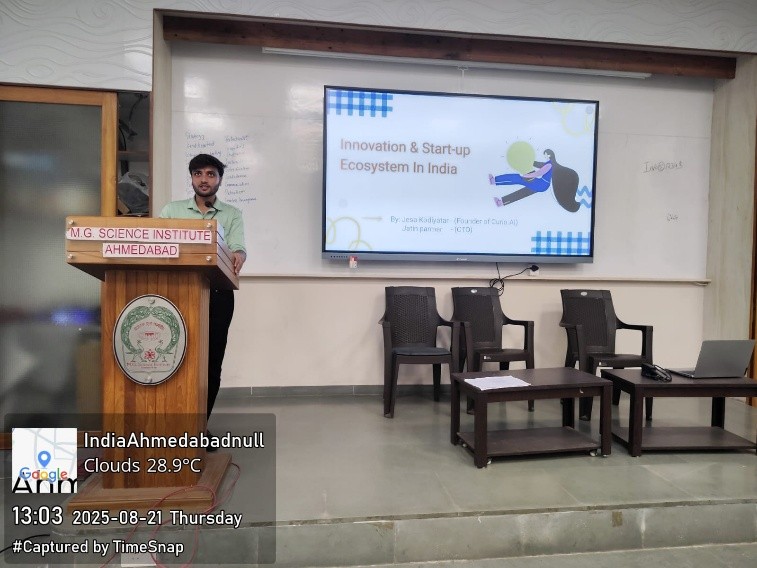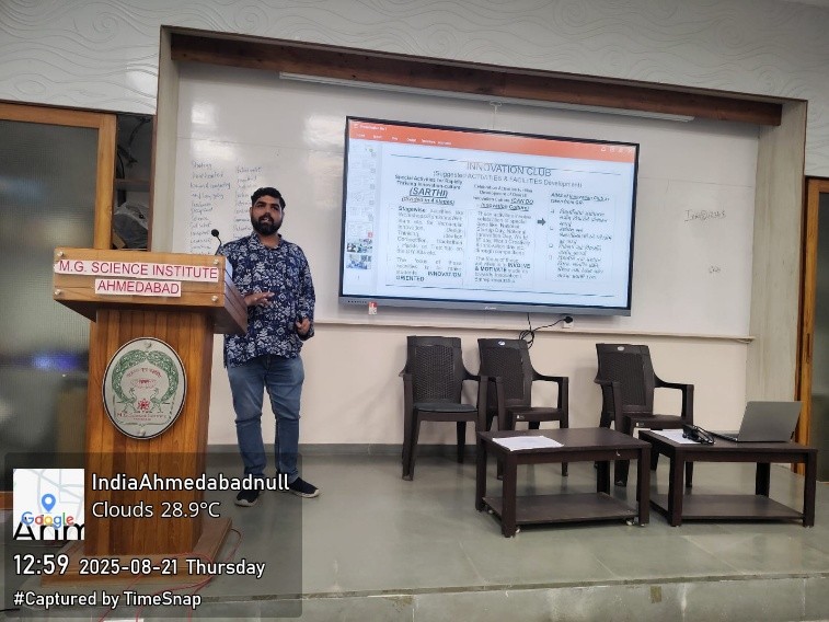 The program commenced with a formal welcome and introduction by Dr. Rina Shah, committee member of the Innovation Club. This was followed by an address from Dr. Kirit Vaniya, coordinator of the Innovation Club, who introduced the vision and objectives of the club. He highlighted previous activities of innovation club and how the club acts as a structured pathway for students to reach opportunities under the Student Start-up and Innovation Policy (SSIP) and explained the various government schemes available to nurture innovation and entrepreneurship.