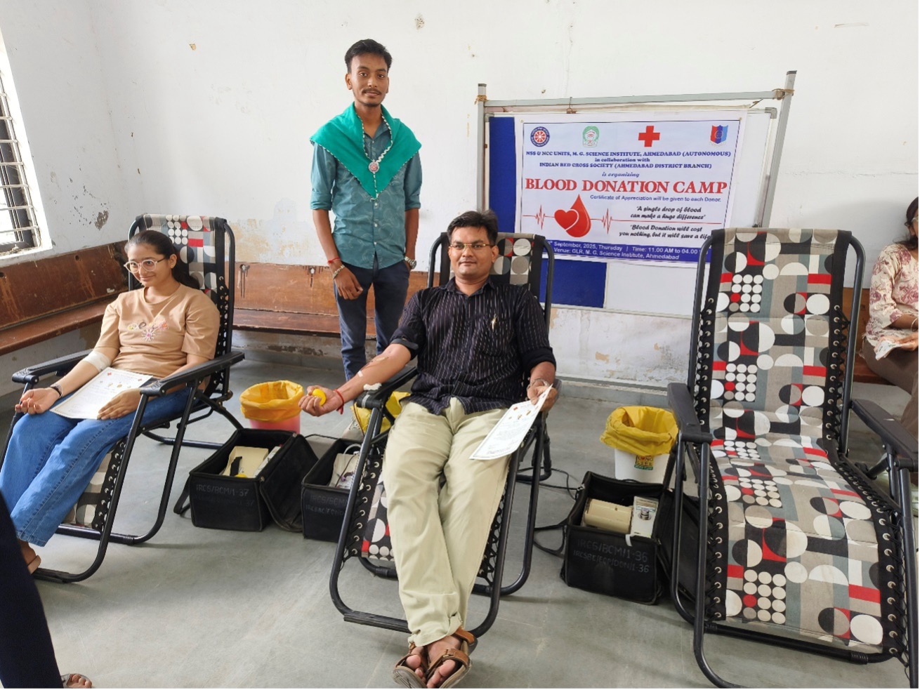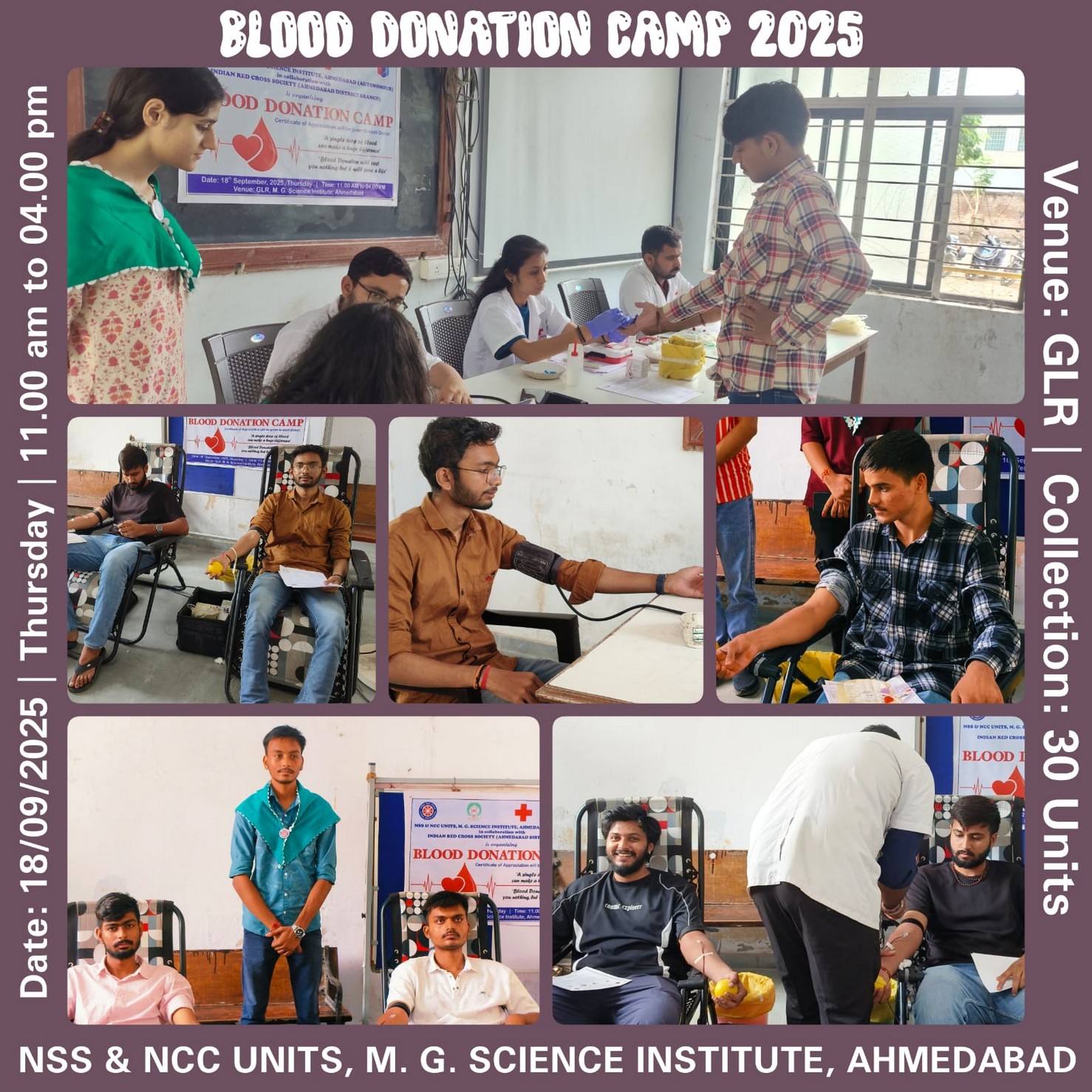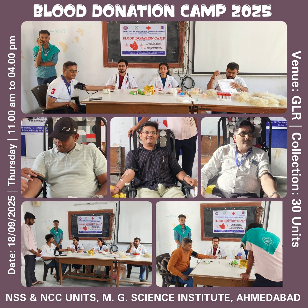 The NSS and NCC Units of M. G. Science Institute, Ahmedabad (Autonomous), in collaboration with the Indian Red Cross Society (Ahmedabad District Branch), organized a Blood Donation Camp on 18th September, 2025 (Thursday) at GLR, M. G. Science Institute, Ahmedabad. The camp was successfully conducted between 11:00 AM to 4:00 PM.